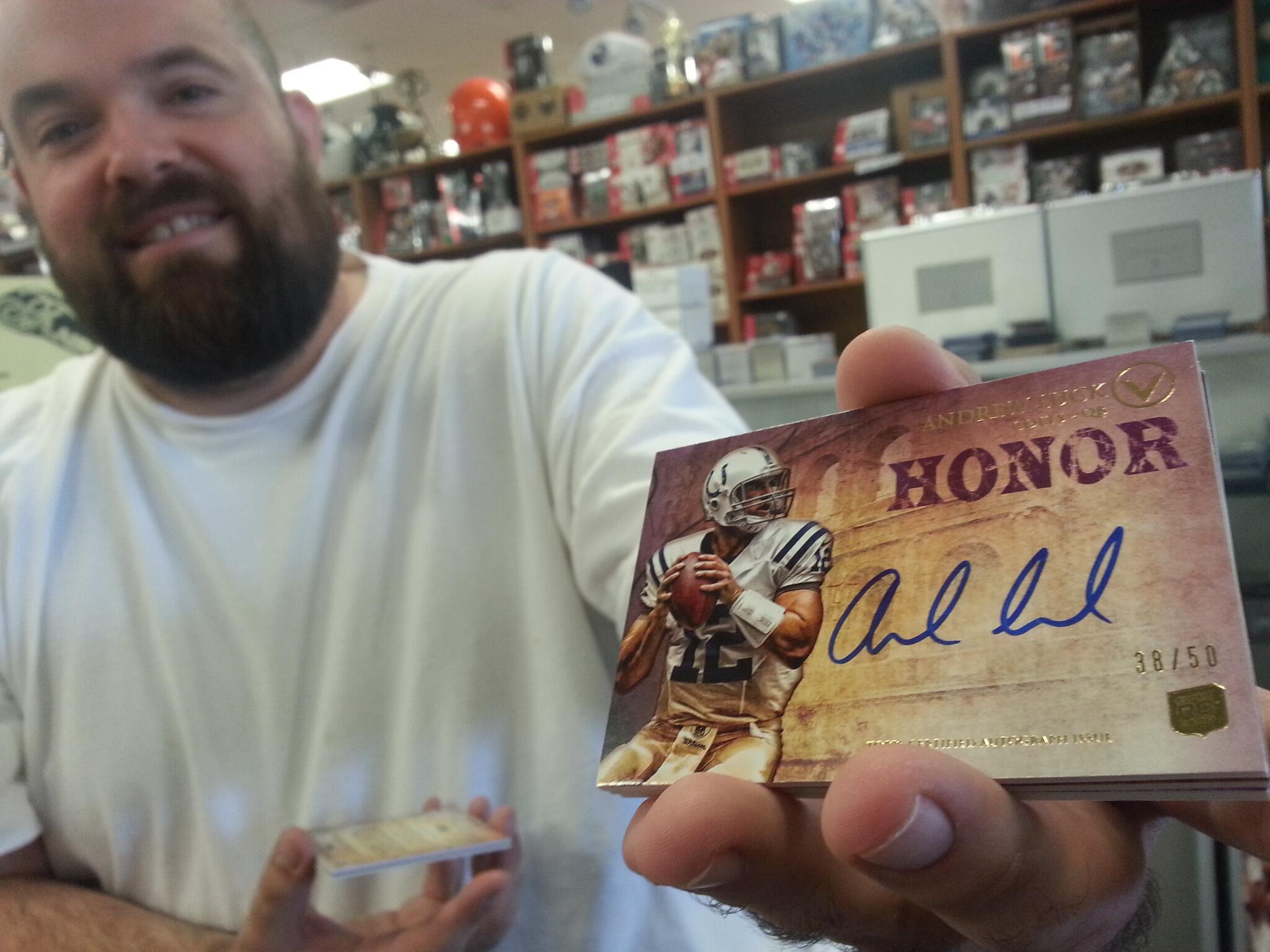Marcus came in and said, "Charlie with all the great hits I've pulled, I've never pulled an Andrew Luck Autographed RC. Pick me out something." I picked a box of 2012 Topps Valor for ONLY $125 per box. Here is Marcus with his first Andrew Luck Auto RC and it's numbered to just 50.