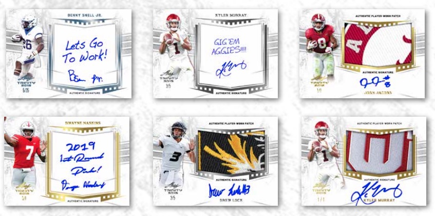 College football fans and NFL fans for that matter, are always blown away by the Leaf Trinity Football brand's generous supply of impressive college jersey premium patches. 2019 Leaf Trinity Football continues to impress with 2019 NFL Draft picks with potential to take the NFL by storm. The high-end draft release is all autographs, five of them. As always, they come with three distinct styles.